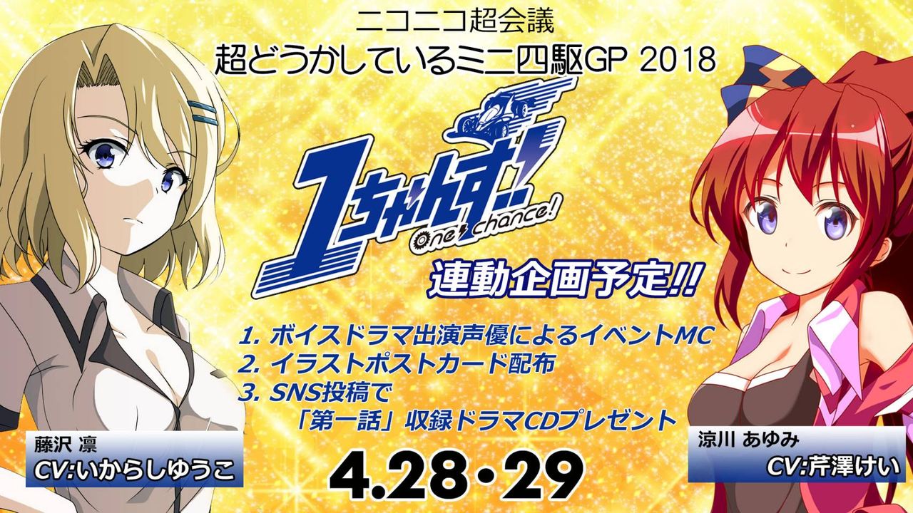 今年もミニ四駆のボイスドラマを中心に色々な創作活動を行っている「1ちゃんす!」さんご協力の元、出演声優、芹澤けい さんと、いからしゆうこ さんがMCとして2日間参戦!!レースを熱く、美しく盛り上げてくれるぞ!!